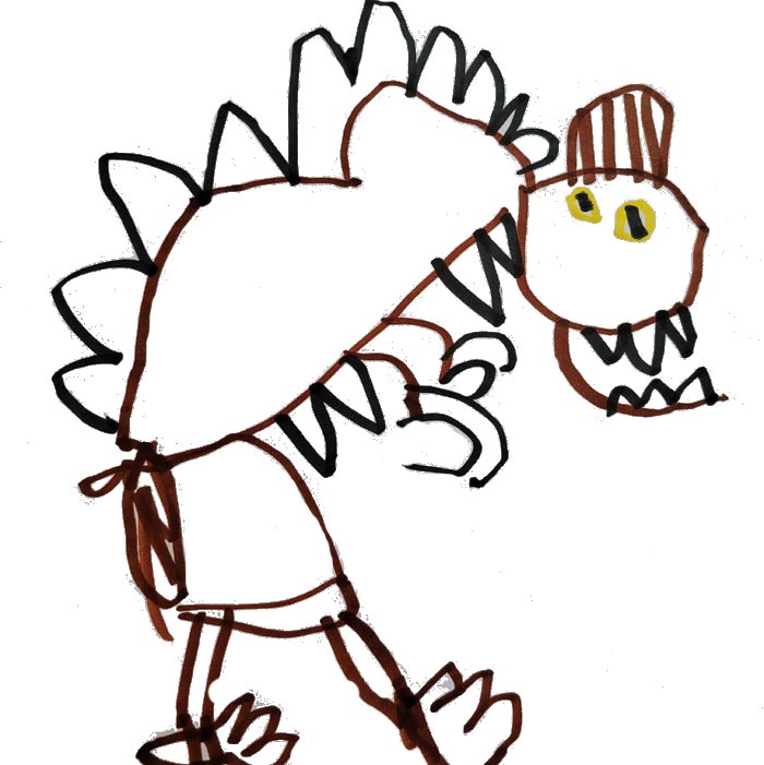 AI: What a super fun dinosaur drawing! Let me guess… it has a big round body, pointy black spikes on its back, and sharp claws on its hands and feet. Is it a stegosaurus? Did I get it right?